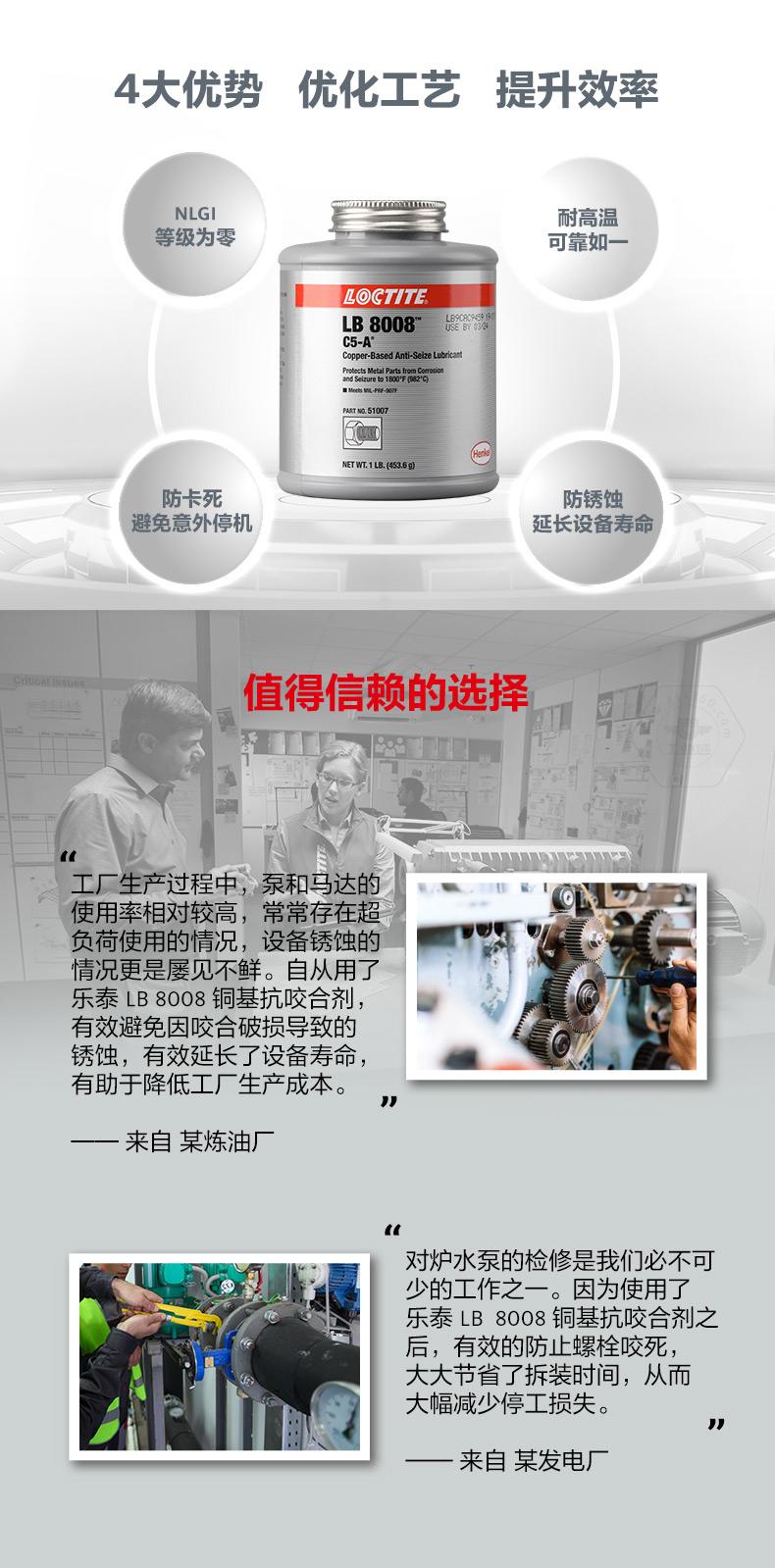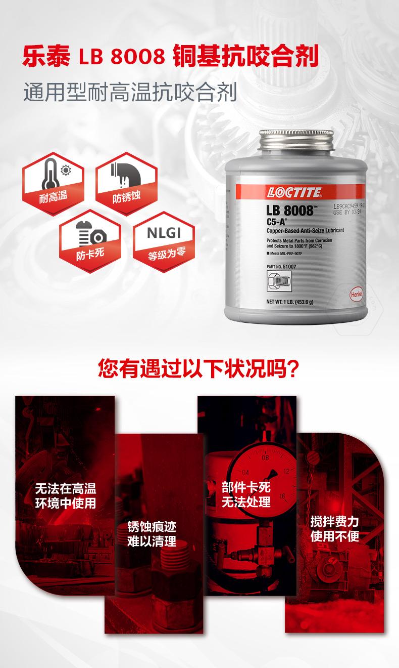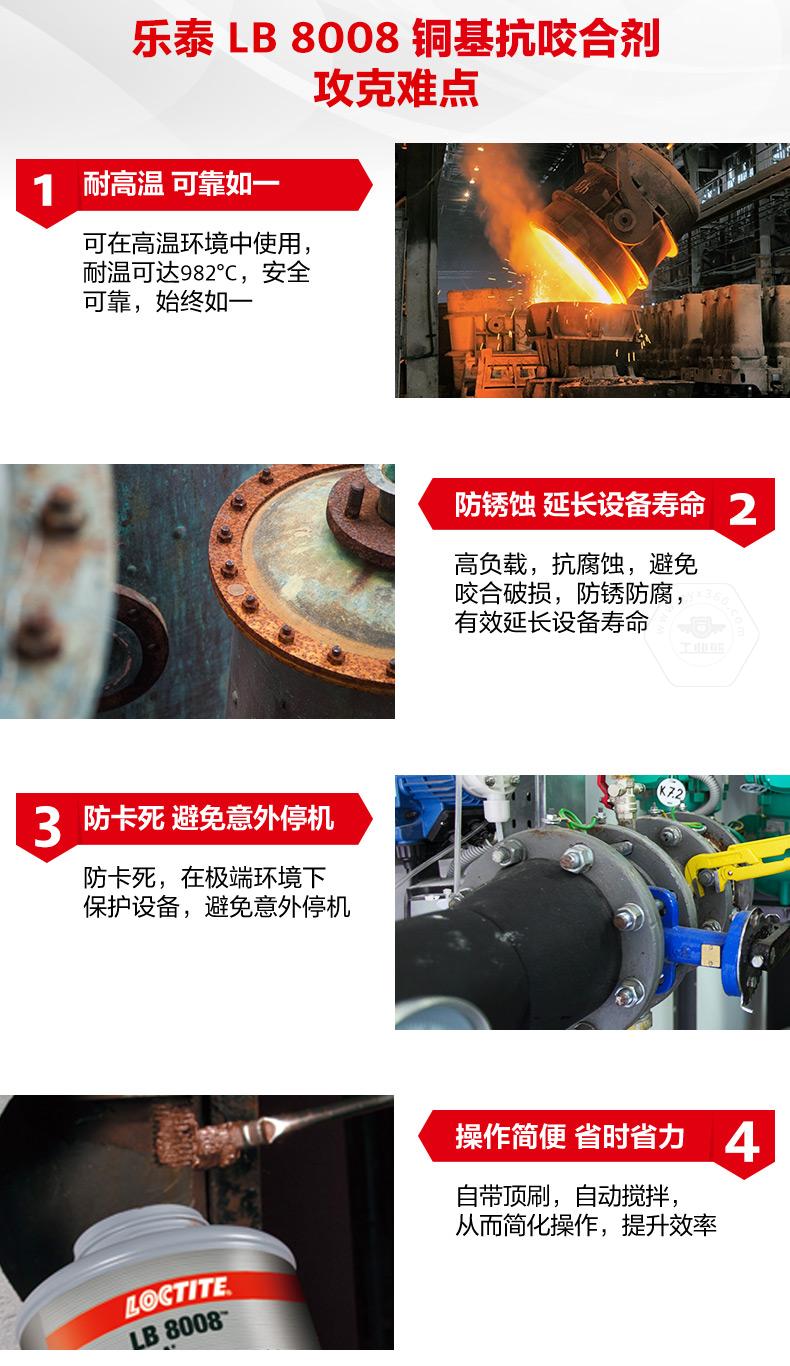 樂泰LB8008銅基抗咬合劑是一款通用型耐高溫抗咬合劑。樂泰LB8008銅基抗咬合劑耐溫可達(dá)982℃,具備防銹蝕、防卡死、NLGI等級為0等特點(diǎn)。樂泰LB8008銅基抗咬合劑適用于高負(fù)載和極端環(huán)境,可幫助避免咬合破損、延長設(shè)備壽命、減少意外停機(jī)。樂泰LB8008銅基抗咬合劑自帶頂刷并可自動攪拌,操作更簡便,適用于采礦、發(fā)電、石化、鐵路、水處理等行業(yè)。